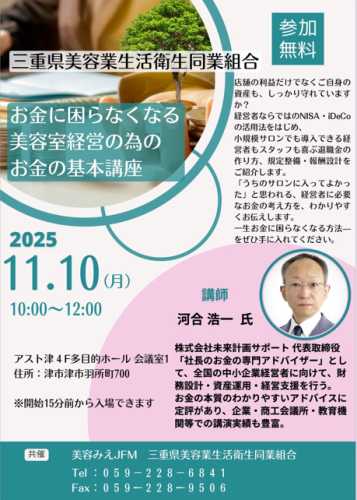 HOME お知らせ・イベント R7.11.10 お金のセミナー開催! News - Eventsお知らせ・イベント 2025/10/10 お知らせ・報告 R7.11.10 お金のセミナー開催! お知らせ・報告 Sun 美 ウェーブ R7.9月号 2025/10/01 お知らせ・報告 衛経貸付の活用についてのご案内(R7.10) 2025/10/01 お知らせ・報告 三重県TMモード発表会開催! 2025/09/03 一覧を見る