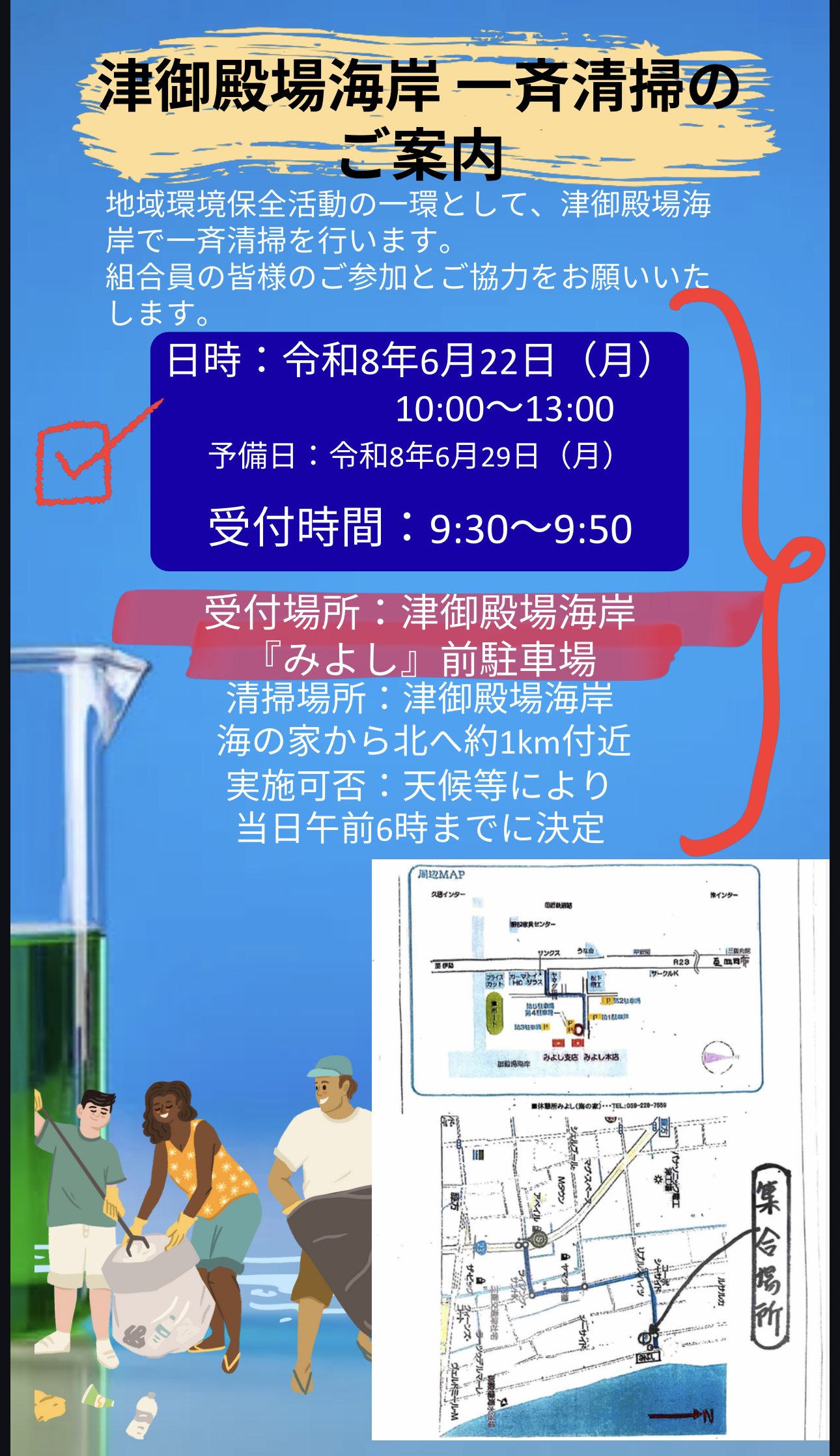 HOME お知らせ・イベント R8年度せいえい一斉清掃(御殿場海岸) News - Eventsお知らせ・イベント 2026/03/13 お知らせ・報告 R8年度せいえい一斉清掃(御殿場海岸) R8年度 御殿場海岸 一斉清掃 参加者募集!! お誘いあわせの上 是非 ご参加ください 詳しくは こちらから ご覧ください お知らせ・報告 衛経貸付の活用についてのご案内(R8.3) 2026/02/27 お知らせ・報告 令和8年 知事表彰式典 2026/02/26 お知らせ・報告 衛経貸付の活用についてのご案内(R8.1) 2026/01/06 一覧を見る